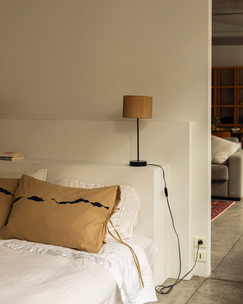 A linen scrap, in the color of dark water, was preserved after cutting from the RIVAGE collection. It was re-cut, appended and topstitched with gold thread.
