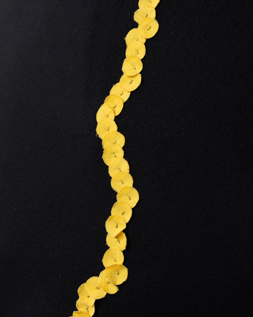 Yellow linen scraps from the RIVAGE collection have been preserved. They were then re-cut, appended and hand-stitched with gold thread.