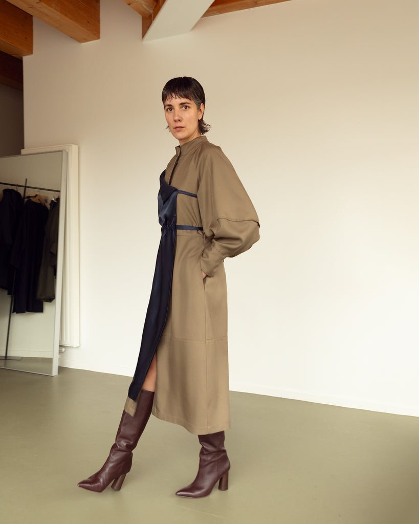 Its cut and asymmetry shape the silhouette. This strong piece builds a look in its own right.