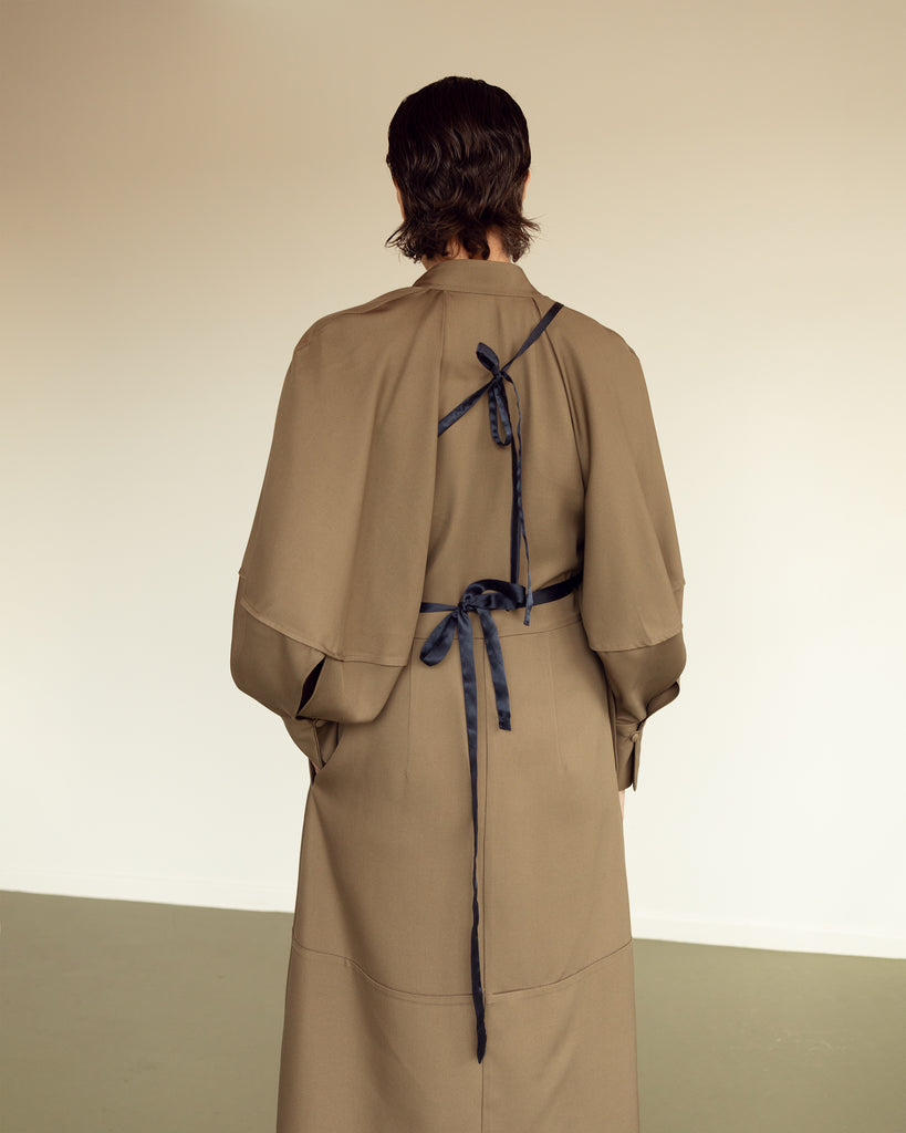 It fastens at the waist and crosswise at the back, and can also be fastened at the waist only, to create playful layering.