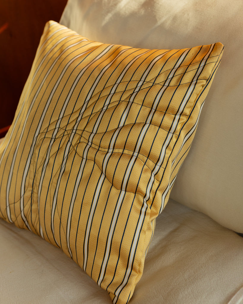 This cushion cover is made from striped silk, quilted and then topstitched. Only a single piece could be made, as the available fabric was extremely limited.